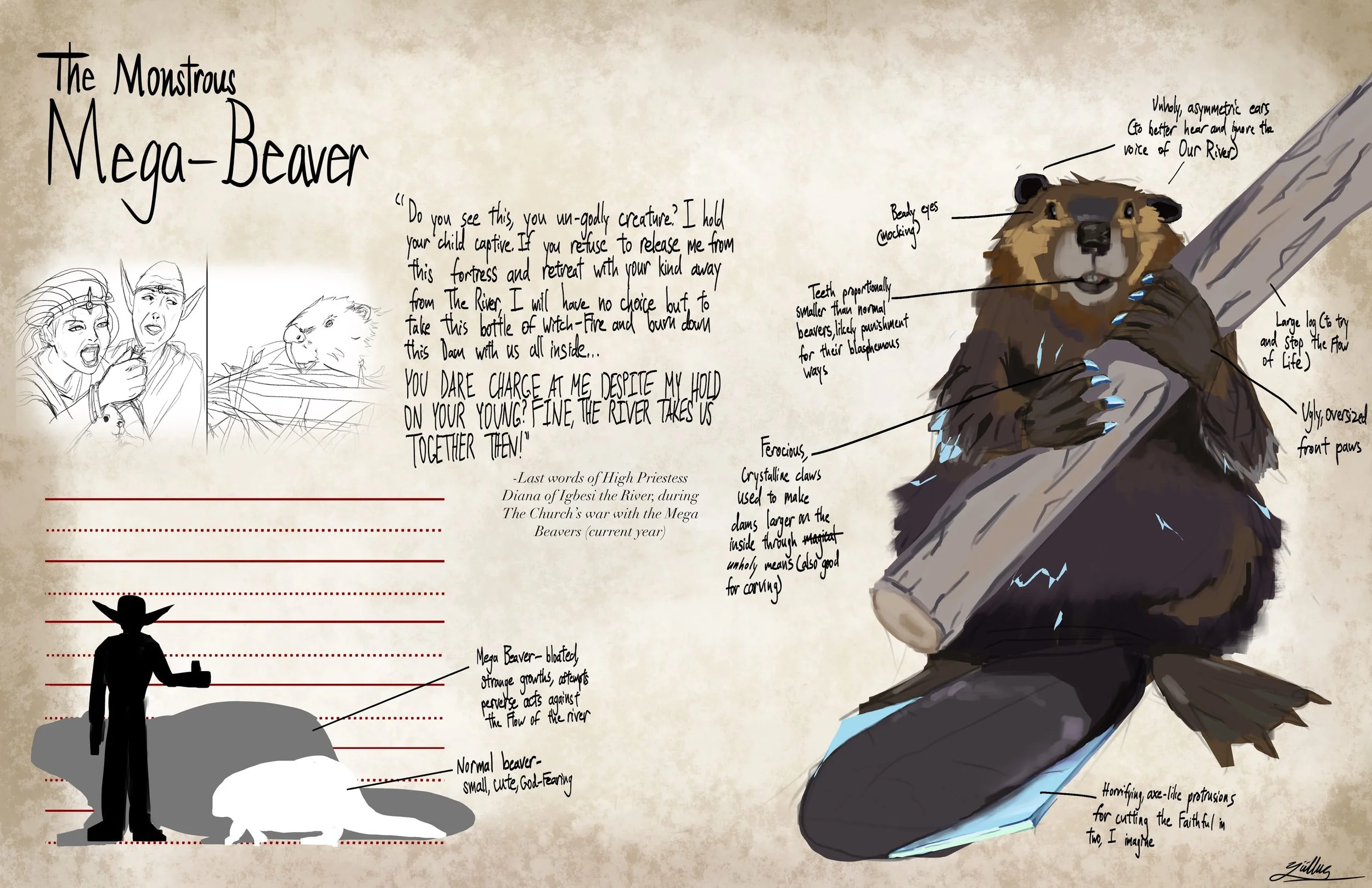 The Mega-Beaver started primarily as a joke- in a Dungeons and Dragons campaign my friends and I created a religion based around the existence of an extremely large river. We joked about how the fictional church would react if there were massive beavers trying to dam up the river (out of no ill intent, as they are beavers).